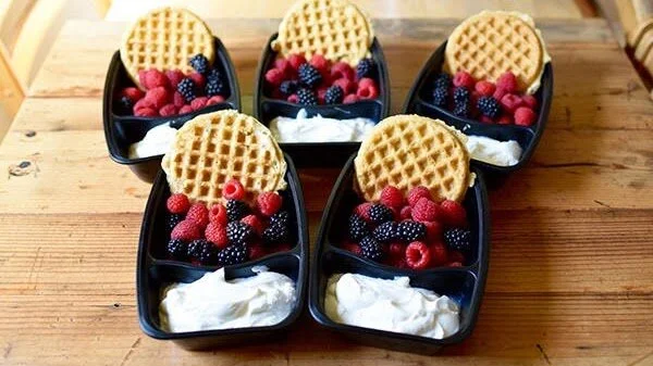 Place ¾ cup plain lowfat Greek yogurt in a food storage container. Top with one cup mixed berries (or other fresh fruit). Serve with one whole-grain, frozen waffle that has been thawed or toasted.